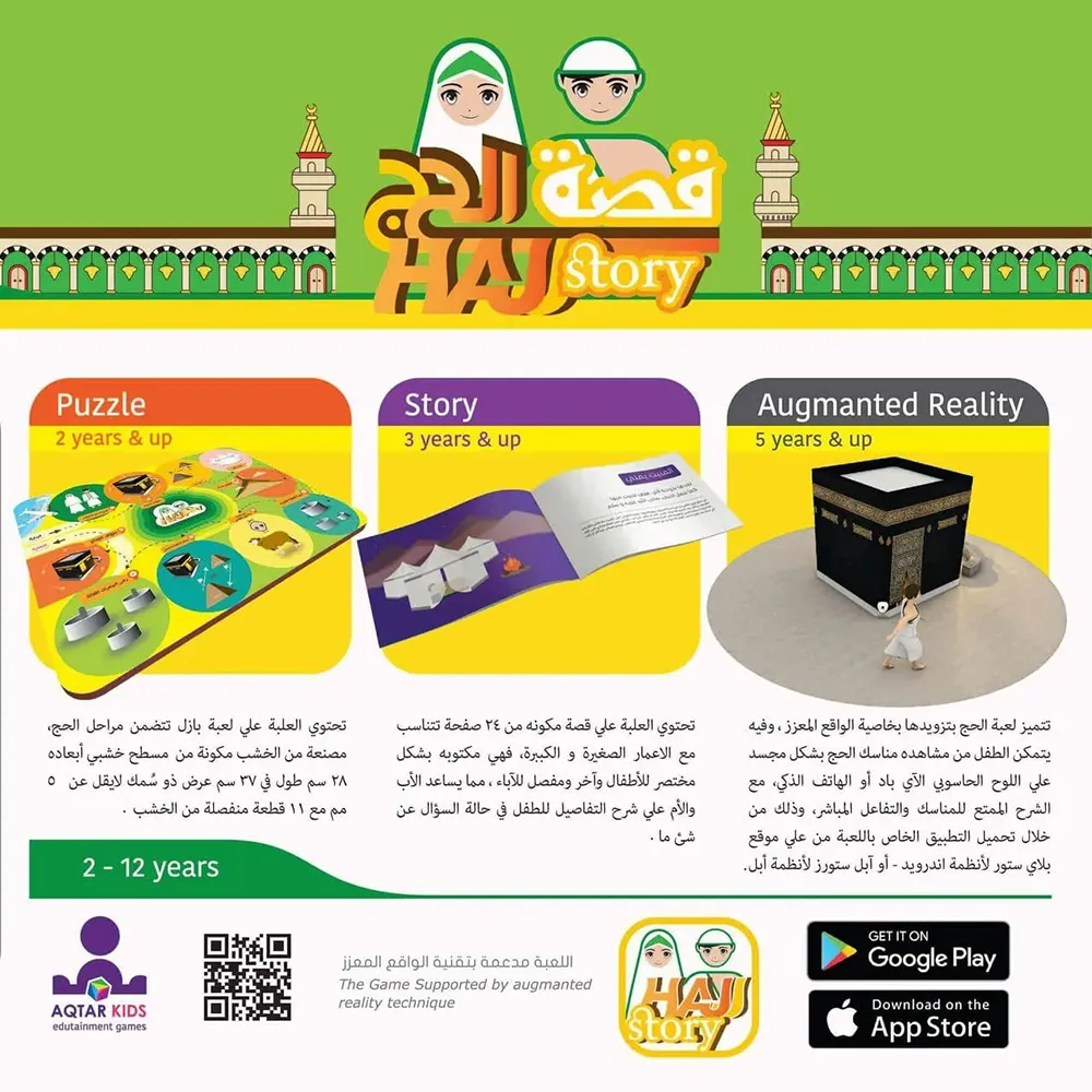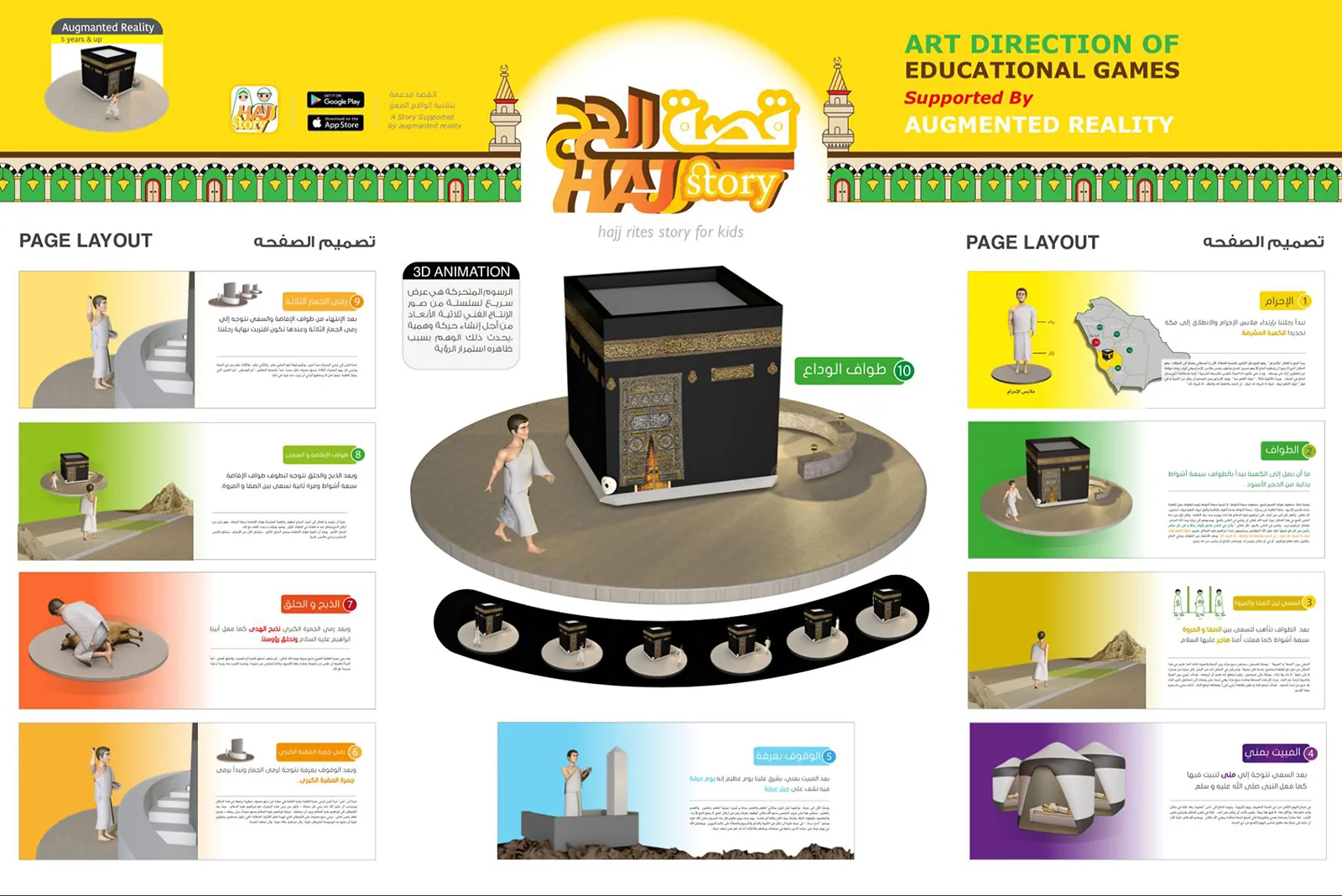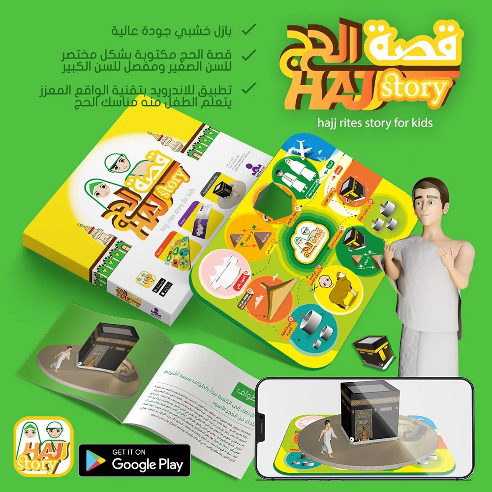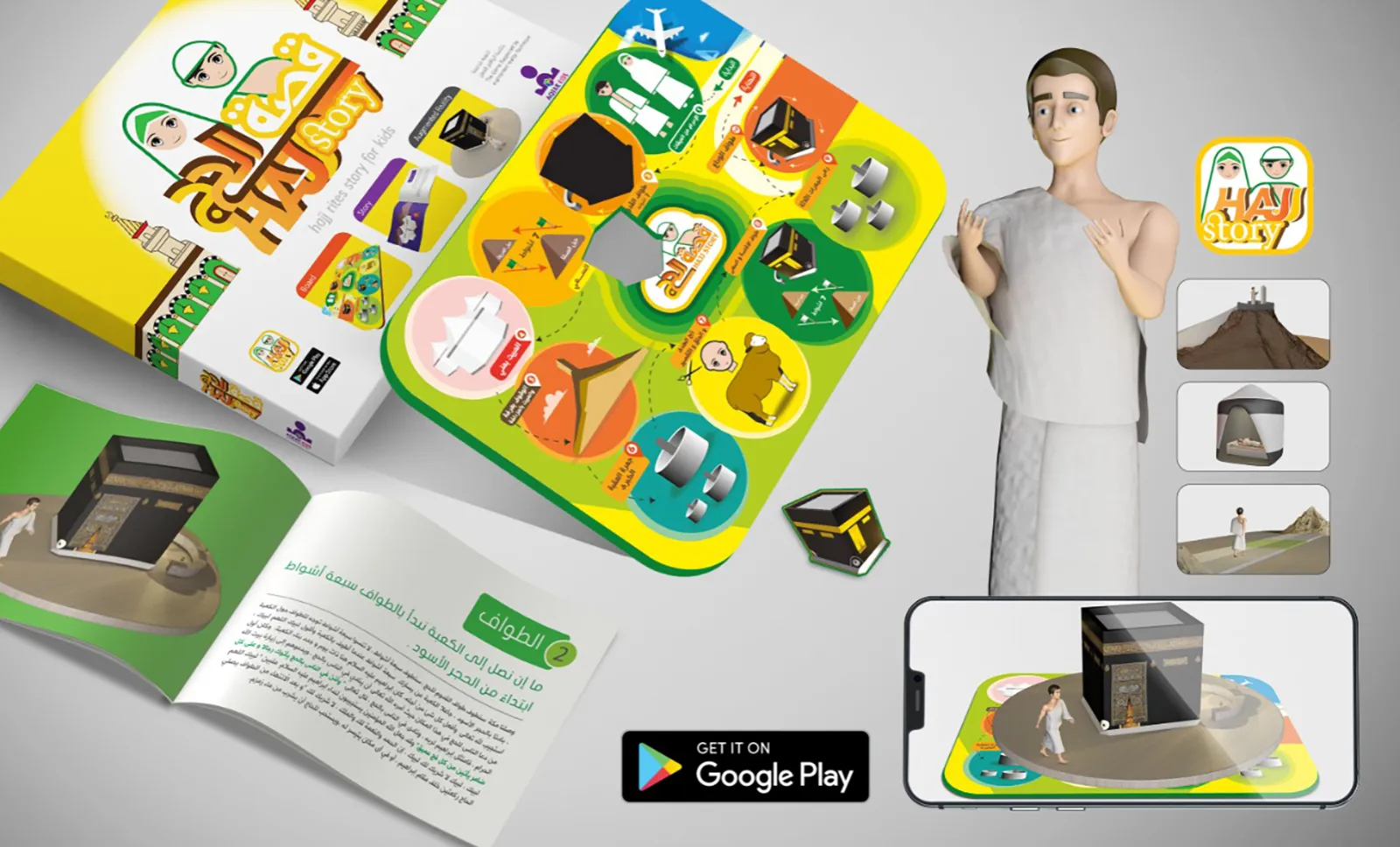 تطبيقين لتعليم الصلاة والحج بتقنية الواقع المعزز (AR) وتتكون اللعبة من لوح تعليم الصلاة ولوح بازل خشب لتعليم مناسك الحج وسجادة للصلاة بالإضافة إلى ورق شرح استخدام اللعبة وقلم بورد وتطبيق أندرويد